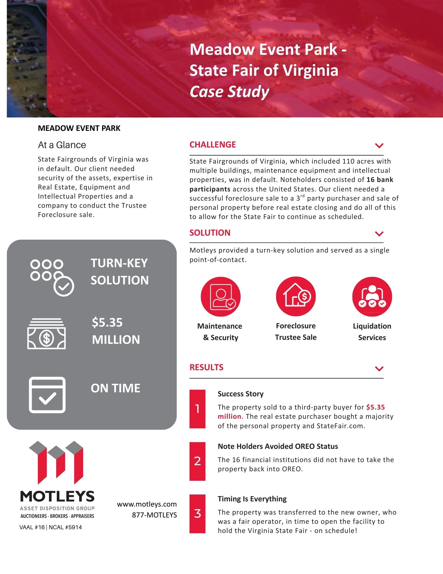 State Fairgrounds of Virginia: State Fairgrounds of Virginia was in default. Our client needed security of the assets, expertise in Real Estate, Equipment and Intellectual Properties along with a company to conduct the auction.