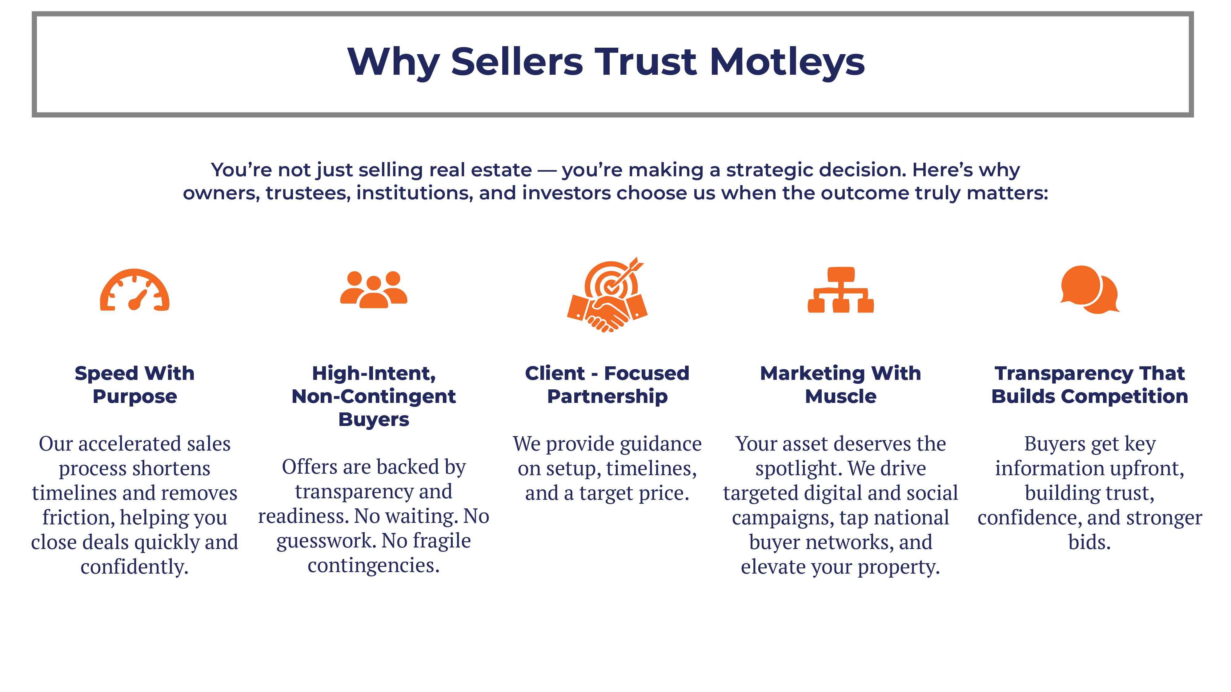 Motleys Commercial Real Estate achieves exceptional sell-through rates by letting competition—not guesswork—set the price. With time-certain outcomes, non-contingent contracts, and intensified buyer engagement, our sellers often exceed their floor price while maintaining total confidence in the process.