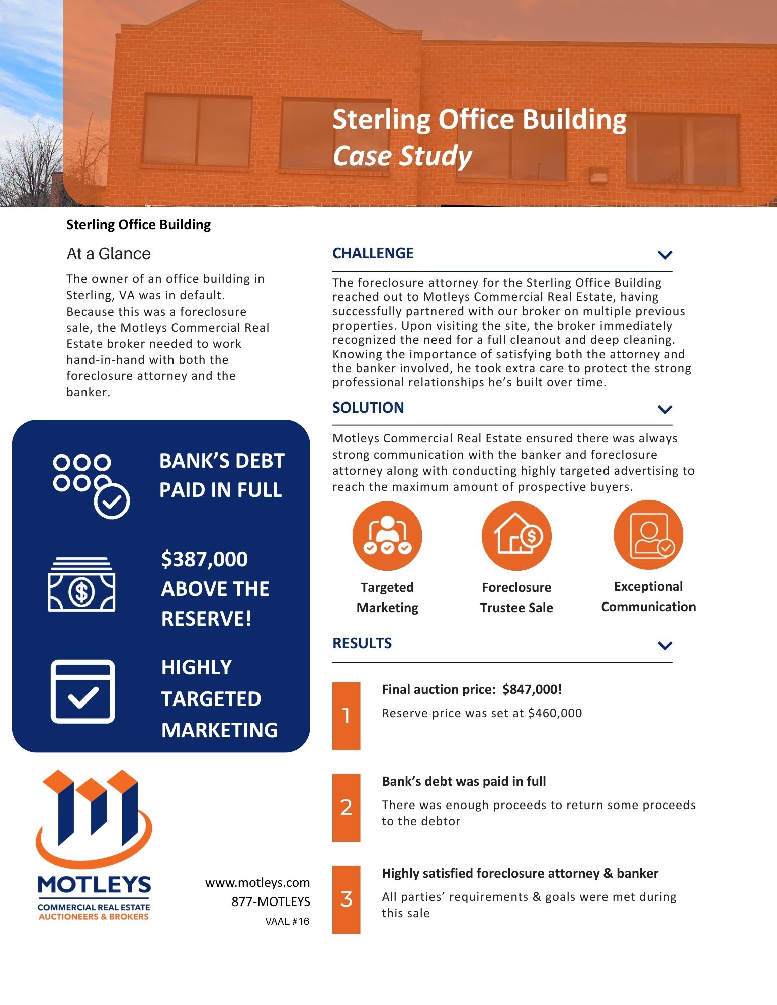 Sterling Office Building: The owner of an office building in Sterling, VA., was in default. Because this was a foreclosure sale, the Motleys team needed to work with both the foreclosure attorney and the banker.